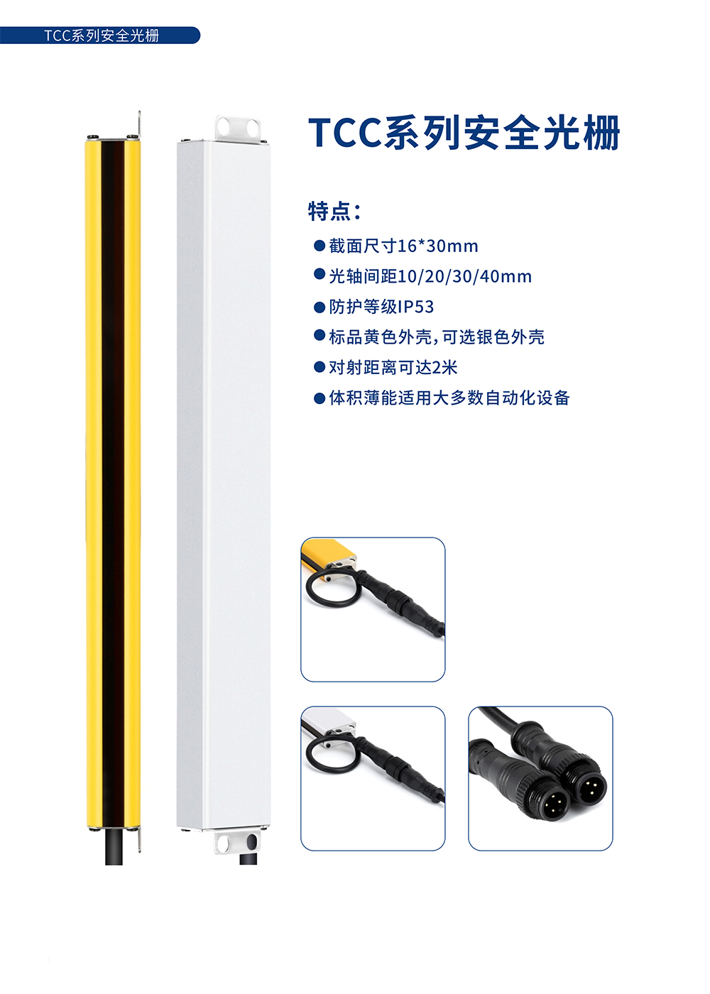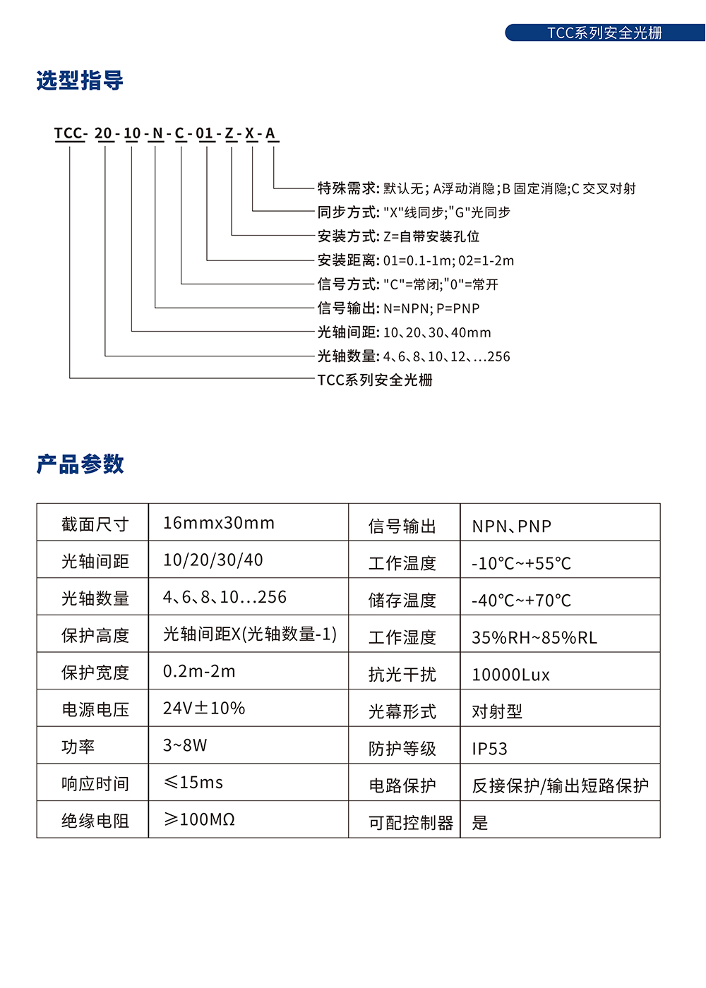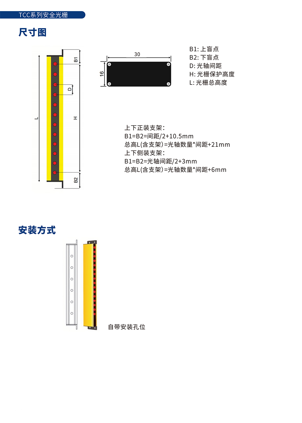 注明:1、侧装⽀架的总⾼度=光轴数量*光轴间距+6mm; 2、上下安装的总⾼度=光轴数量*光轴间距+26mm。 此型号产品光轴间距包括10mm、20mm、30mm、40mm多种,如表格中未找到所选型号,请根据选型规则或联系我们。 可根据客⼾需求定制相应保护⾼度的安全光栅。 | ||||||||
