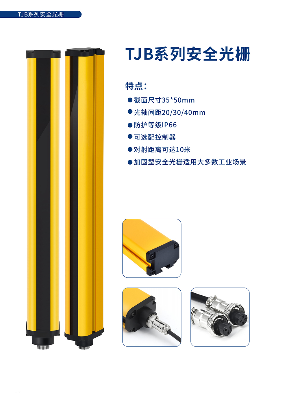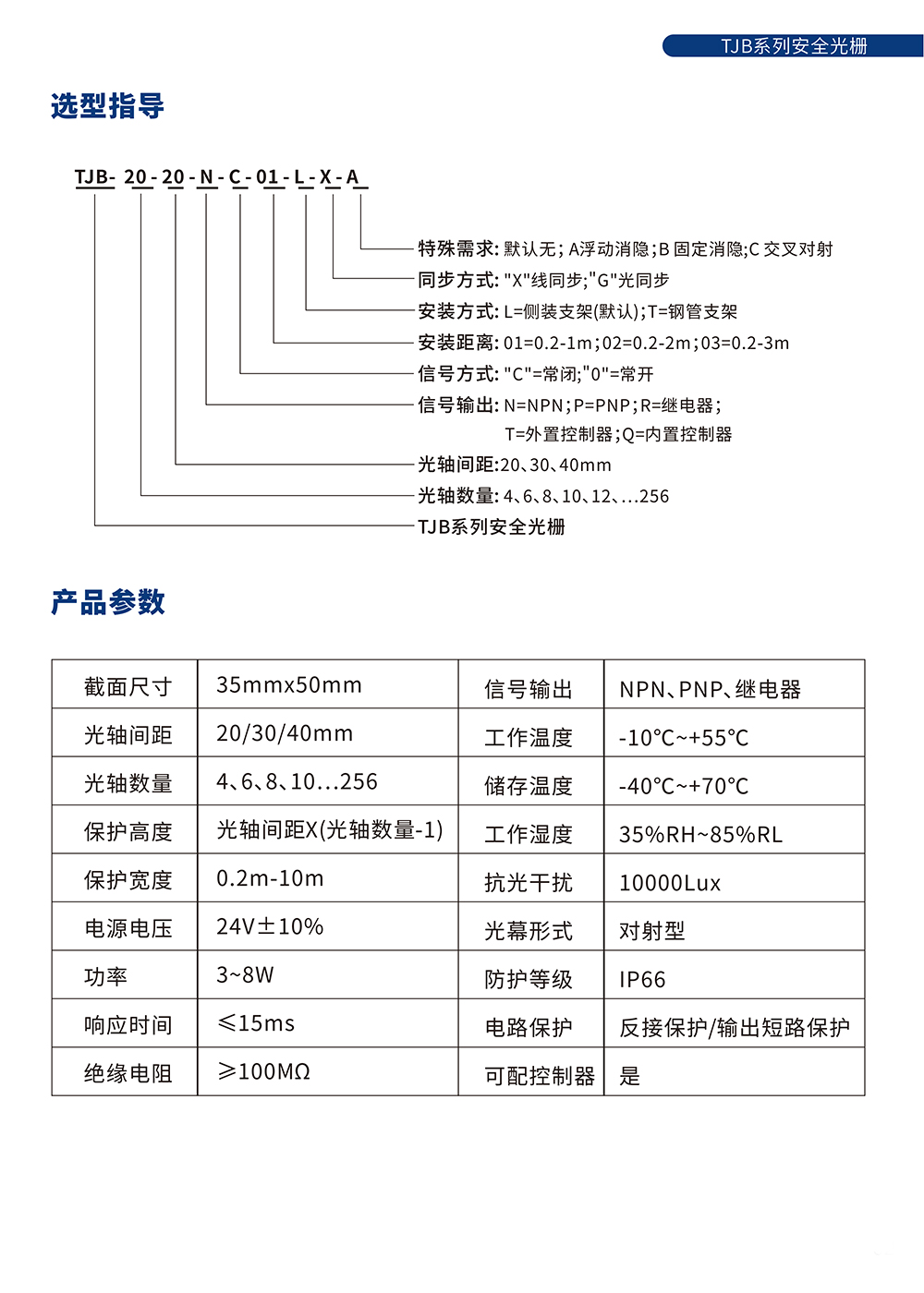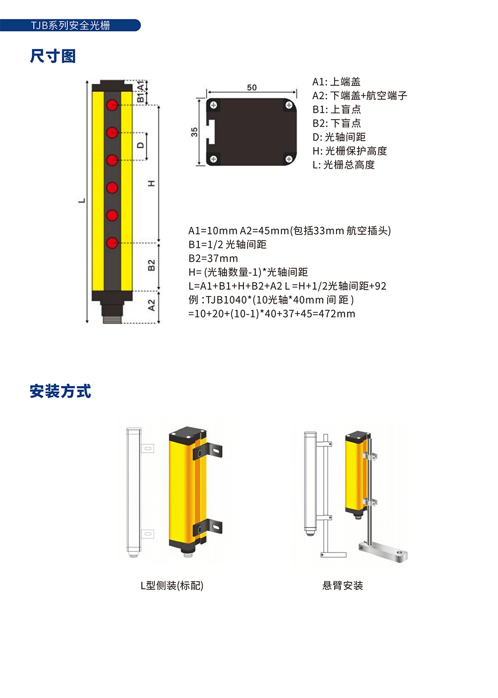 注明:此型号产品光轴间距包括20mm、30mm、40mm,选型表中未完全体现,如您的选择未在其中, 可通过选型规则或联系我们为您选型。 产品总⾼度=保护⾼度+1/2光轴间距+92(包括整套航空插头33mm)。 例:TJB1040(10光轴*40mm间距)=360+20+91=471mm 如您想要其他光轴间距的安全光栅,请联系我们。 | ||||||||